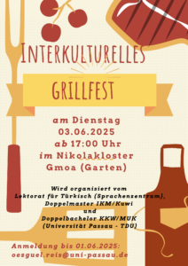 Das diesjährige Interkulturelle Grillfest wurde gemeinsam vom Sprachenzentrum Türkçe Okutmanlığı sowie den Teilnehmer*innen der Doppelmaster-Programme IKM/KUWI und der Doppelbachelor-Programme KKW/MUK organisiert.