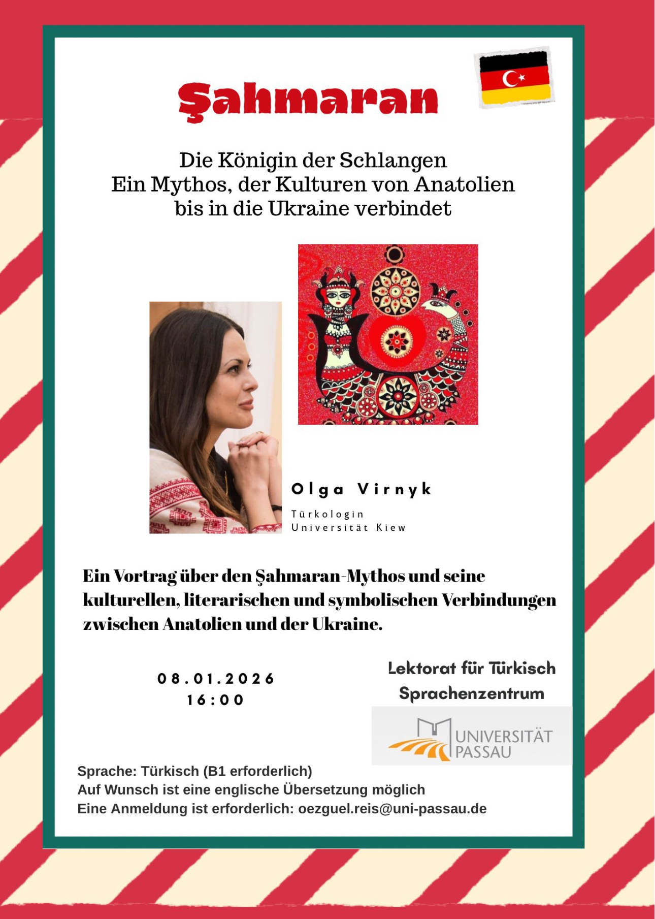 Am 8. Januar 2026 lud das Sprachenzentrum die Turkologin und Türkischlektorin Olga Virnyk ein. Im Rahmen der Veranstaltung wurde Şahmaran, eine der bedeutenden mythologischen Figuren des Kulturraums Anatolien und Mesopotamien, aus einer interdisziplinären Perspektive behandelt. Ziel des Vortrags war es, die Şahmaran-Mythologie nicht nur als folklorische Erzählung, sondern als ein vielschichtiges kulturelles Phänomen im Kontext von Geschichte, Mythologie, kulturellem Gedächtnis und symbolischem Denken zu betrachten.
