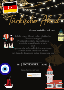 Türkischer Abend bot den Teilnehmern durch seine aktive und praxisorientierte Struktur die Möglichkeit, die türkische Kultur aus nächster Nähe kennenzulernen, und wurde als ganzheitliche Veranstaltung durchgeführt, die durch Sprache, Kunst, Kulinarik und Musik den kulturellen Austausch stärkte.